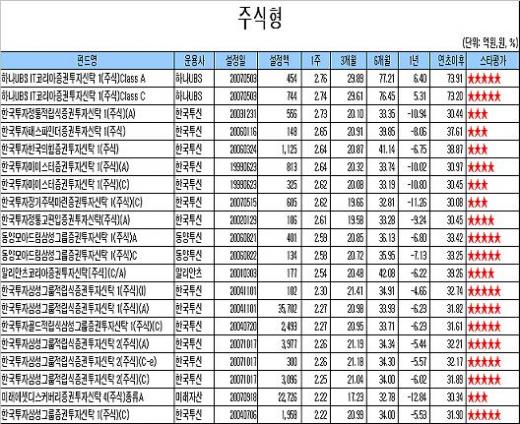 국내 대표산업인 IT업종에 집중 투자하는 '하나UBS IT코리아증권투자신탁 1(주식)Class A'가 2.76%의 수익률을 기록, 평가 대상 중 가장 우수한 성적을 올렸다.