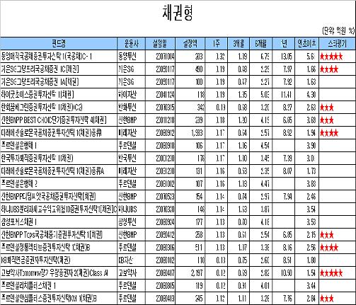 채권형펀드는 수급부담 해소와 신용경색 완화로 국고채, 회사채 등 주요 금리가 일제히 하락하면서 지난 한 주간 0.13%의 평균수익률을 기록했다. 전주에 이어 2주 연속이다.