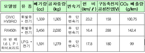 시빅 하이브리드는 배기량 1339cc로 휘발유를 사용하며 연비는 23.2km/ℓ. RX450h는 3456cc로 휘발유를 사용하며 연비는 16.4km/ℓ이다.