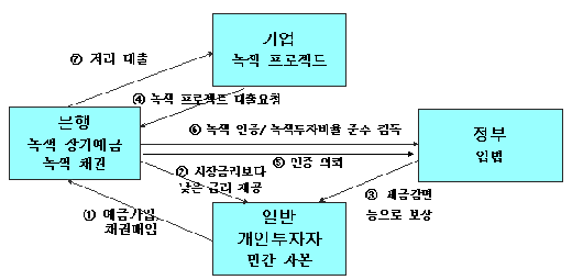 민간자금을 녹색투자로 돌리기 위한 핵심 매커니즘은 녹색펀드 녹색예금 녹색채권으로 조성한 자금을 녹색인증을 받은 기술이나 프로젝트 또는 녹색기업이 발행한 증권에 투자하는 것이다.