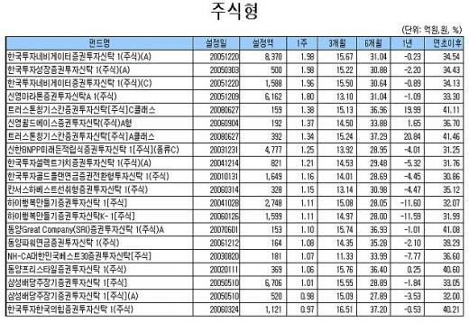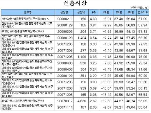 섹터펀드 중에선 '슈로더이머징마켓커머더티증권자투자신탁A종류A(주식)'(3.14%)와 '동양글로벌IPO뉴스탁증권자투자신탁 1(주식)A'(2.88%), '미래에셋인디아인프라섹터증권자투자신탁1(주식)종류A'(1.63%) 등이 상위권에 이름을 올렸다.
