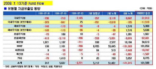 한편 이달 들어 뭉칫돈이 들어왔던 채권형펀드는 3거래일 만에 211억원이 빠져나갔고 머니마켓펀드(MMF)에서도 266억원이 유출됐다. 파생상품 펀드와 재간접펀드도 각각 282억원과 5억원 순유출을 기록했다.