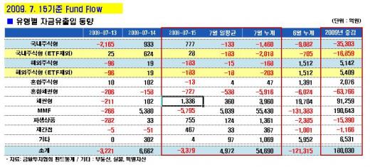 한편 채권형펀드로 1336억원이 순유입됐다. 반면 전날 5000억원이 넘는 뭉칫돈이 들어왔던 머니마켓펀드(MMF)는 이날 다시 5795억원이 빠져나갔다.