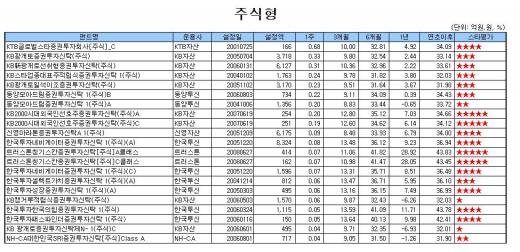 이에 비해 대형주 위주의 펀드들은 선방했다.'KTB글로벌스타증권투자회사[주식]_C'가 0.68%의 수익률로 주간 성과 1위를 기록했고 'KB광개토증권투자신탁(주식)'이 0.33%, 'KB스타업종대표주적립식증권투자신탁 1(주식)'이 0.24%, '동양모아드림증권투자신탁 1(주식)B'가 0.22%로 뒤를 이었다.