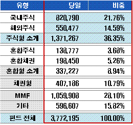 채권형펀드 수탁액은 전날보다 7443억원 순증가했다. 주로 기관투자자의 자금 집행이 늘고 있는 것으로 풀이된다.