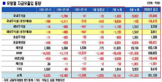 월말 자금 이탈 움직임이 두드러진 머니마켓펀드(MMF)는 이날도 1조2922억원이 이탈했다. 7월 한 달 MMF에선 2조6410억원이 빠져나가 3개월 연속 유출세를 나타냈다. 다만 전월(-13조1384억원)보다는 유출폭이 크게 줄었다.