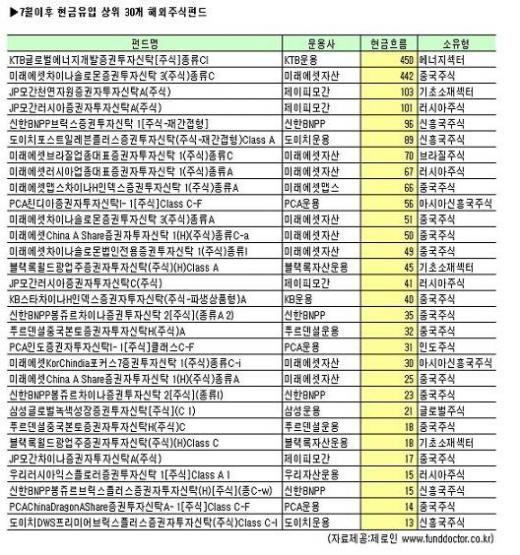 '미래에셋차이나솔로몬증권투자신탁 3(주식)종류C'(442억원)를 비롯해 현금 유입 상위권에 오른 펀드 중 13개가 중국펀드다. 여기에 친디아 및 브릭스 등 지역펀드까지 포함하면 모두 19개가 중국 관련 펀드다.