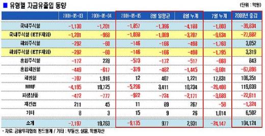 이날 머니마켓펀드(MMF)에선 5296억원이, 혼합형펀드에선 952억원이 순유출됐고, 채권형펀드는 12억원이 순유입됐다.