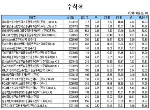 9일 펀드평가사 모닝스타코리아에 따르면 지난 한 주간(8월 3~7일) 국내주식형펀드(설정일 6개월, 설정액 100억원 이상)는 평균 2.02%의 수익을 올렸다. 이 기간 코스피는 1.97% 상승했다.