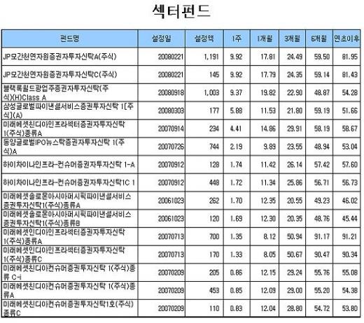 섹터펀드 가운데서도 'JP모간천연자원증권자투자신탁A(주식)'(9.92%)과 '블랙록월드광업주증권자투자신탁(주식)(H)Class A'(9.92%) 등 원자재펀드의 강세가 돋보였다. 특히 'JP모간천연자원증권자투자신탁A(주식)'는 연초 이후 수익률이 81.95%에 이른다.