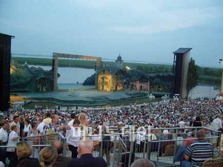 공연시작 전, 호수 건너편 독일에서 오페라를 보러 온 사람들의 배가 석양을 등지고 무대 왼편의 선착장으로 들어오는 모습을 보는 것도 이 공연의 또 다른 매력이다. 석양이 모습을 감춘 뒤, 캄캄한 밤하늘 잔잔히 빛나는 달빛을 조명 삼아 호수를 무대로 공연되는 오페라를 보고 있으면 세계에서 각국에서 이 작은 마을로 모여드는 이유를 쉽게 알 수 있다.