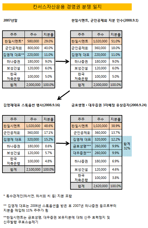 앞서 금호생명과 대우증권은 작년 9월 칸서스자산운용 주주로 참여했다. 이들은 김영재 대표측의 '우호지분'으로 분류된다.