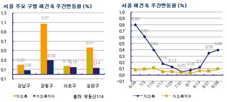 서울 재건축 아파트 매매가도 0.40% 올라 지난주(0.35%)보다 오름폭이 커졌다. 휴가철이 막바지에 이르면서 재건축 아파트에 대한 매수문의, 거래가 늘었다.