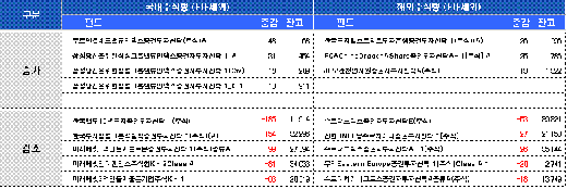 해외 주식형펀드 수탁액은 전날보다 282억원 순감소했다. '슈로더 브릭스증권자투자신탁E주식'(-53억원), '신한BNPP 봉쥬르차이나증권투자신탁1주식'(-27억원), '슈로더 브릭스증권자투자신탁A-1주식'(-26억원) 등 신흥시장 펀드를 위주로 자금이 빠졌다.