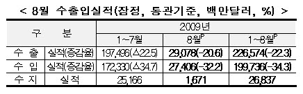 8월 수출은 290억7800만달러로 전년 동기보다 20.6% 감소했다. 최근 글로벌 경기가 회복될 조짐을 보이고 있지만 수출 감소율은 7월의 21.8%에서 1.2% 축소되는 데 그쳤다. 8월 수입은 274억600만달러로 32.2% 감소했다. 감소율은 전달(34.7%)보다는 2.5%포인트 축소됐다.