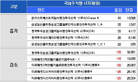 3일 신한금융투자와 금융투자협회에 따르면 상장지수펀드(ETF)를 제외한 국내 주식형펀드 수탁액(1일 기준)은 전날보다 171억원 순증가했다. 주식형펀드 수탁액은 지난달 28일 8거래일만에 순증가로 돌아섰으나 다음날 순감소, 이날 다시 플러스 반전됐다.