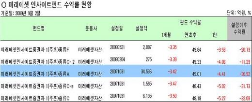 이 펀드의 1년 수익률은 지난 8월 28일 기준 -0.60%로 마이너스로 전환한 이후 31일 -3.02%, 9월 1일 -3.48%, 2일 -4.41% 등 손실폭이 점점 확대되고 있다. 손실폭이 확대되면서 이 펀드의 설정이후 수익률도 -20%대에서 다시 -30%대로 떨어졌다.