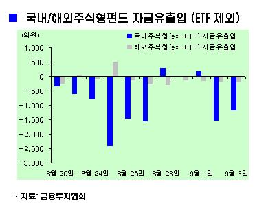 7일 신한금융투자와 금융투자협회에 따르면 상장지수펀드(ETF)를 제외한 국내 주식형펀드는 지난 3일 1185억원 순유출을 기록했다. 이달 들어 8거래일 만에 소폭 순유입으로 돌아선 후 하루만에 다시 자금 유출행진이 이어지면서 사흘 간 총 2571억원이 빠져나갔다.