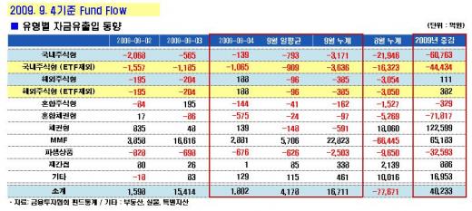 한편 머니마켓펀드(MMF)는 대규모 유출세가 진정되고 3거래일 연속 자금 몰이를 했다. 전날 1조6000억원대 유입에 이어 이날 2881억원이 MMF로 순유입됐다. 채권형펀드 역시 사흘째 자금유입에 성공 139억원을 불러모았다.