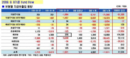 코스피지수가 1610선을 기준으로 보합권에서 움직이던 동안 하루 1000억원대 아래로 줄었던 순유출 규모가 지난 8일 코스피지수가 10p 이상 오르자 다음날인 9일 다시 1000억원대로 확대됐다.