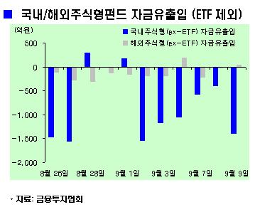 11일 금융투자협회와 신한금융투자에 따르면 지난 9일 상장지수펀드(ETF)를 제외한 국내 주식형펀드에서 1407억원이 빠져나가면서 6거래일 연속 순유출세가 지속됐다.