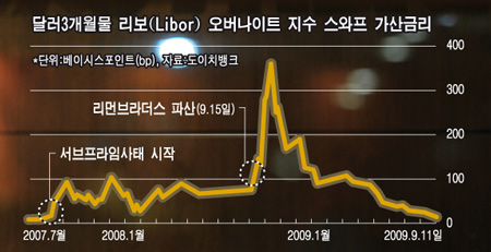 이날은 일본의 회계연도말 결산일이었다. 여기에 금융구제법안이 미 의회에서 부결되면서 영국 자금시장에서 하루짜리 달러 조달 금리(달러 리보)가 6.88%로 사상최고치로 치솟아 올랐다. 불과 1주일전만 하더라도 달러 리보 금리는 2.95%에 불과했다.