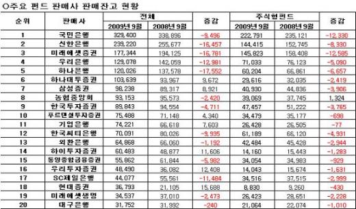 특히 증권업계 펀드강자인 미래에셋증권은 주식형펀드에서만 1조2585억원이 빠져나가 '자산관리명가'로서의 체면을 구겼다. 또 최대 펀드 판매사인 국민은행도 주식형펀드 판매잔액이 1조2330억원 감소했고, 신한은행, 하나은행, 우리은행 등도 5000~8000억원 가량 줄었다.