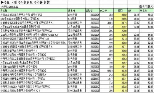 '삼성스트라이크증권투자신탁 1[주식](C)'가 29%의 수익률로 3분기 가장 우수한 성적을 올렸다. 이어 'KTB글로벌스타증권투자회사[주식]_C' 28.9%, '미래에셋5대그룹대표주증권투자신탁 1(주식)종류A' 28.8%, '기은SG그랑프리포커스금융증권[주식]' 28%로 그 뒤를 이었다.