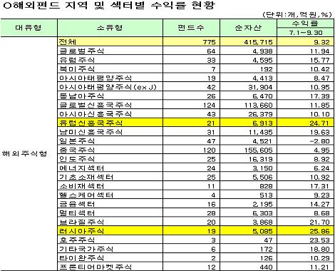 글로벌 증시 호전으로 해외 주식형펀드도 지난 3분기 9.32%의 평균수익률을 올렸다. 투자지역별로는 러시아펀드가 25.86%, 유럽이머징펀드 24.71%, 호주펀드 23.53%, 브라질펀드 21.70%를 각각 기록했다.