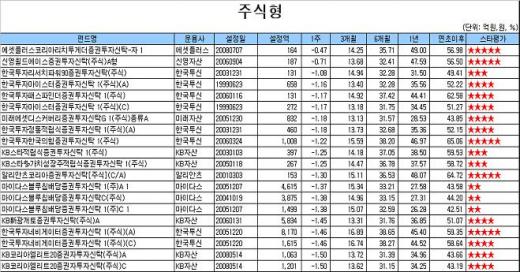 또 글로벌 1등 기업에 주로 투자하는 '신영월드에이스증권투자신탁(주식)A형'이 -0.71%를 기록했고, 대형주와 성장주에 집중 투자하는 '한국투자리서치파워90증권투자신탁(주식)'(-1.08%)과 '한국투자마이스터증권투자신탁 1(주식)(A)'(-1.16%) 등도 평균 이상의 성과를 올렸다.