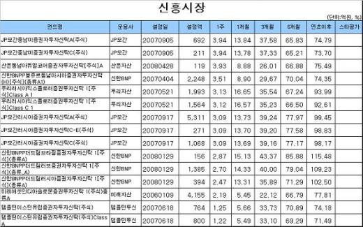 해외 주식형펀드는 선진국보다 이머징마켓에 투자하는 펀드가 상대적으로 좋은 수익률을 올렸다. 또 소비재(컨슈머) 및 원자재에 투자하는 섹터펀드들도 선전했다.