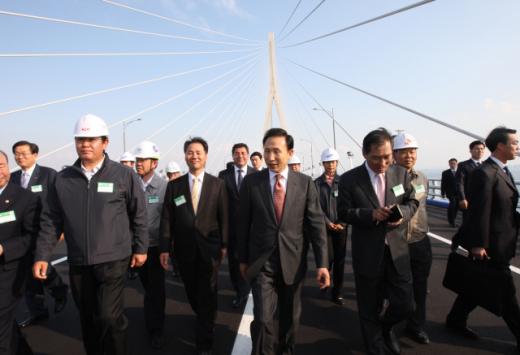 이 대통령은 이날 오후 총연장 21.4킬로미터로 인천 송도와 영종도를 연결하는 국내 최장 거리의 인천대교 개통식에 참석해 "지난 52개월 동안 어려움을 극복하고 공사를 무사히 마친 여러분의 노고에 감사드린다"며 이같이 말했다.