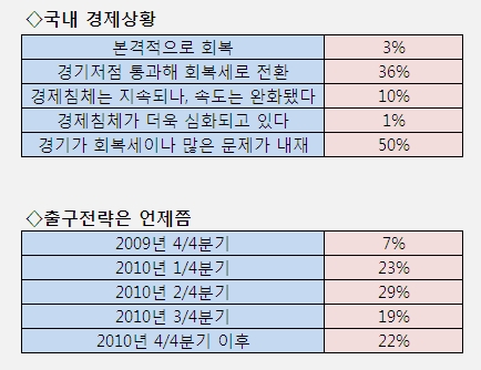 다만 전체 응답자의 50%는 '경기가 회복세를 보이지만 많은 문제가 내재됐다'고 응답, 불안감이 여전히 상존하는 것으로 평가됐다.