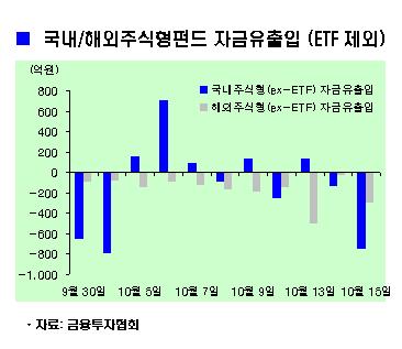 상장지수펀드(ETF)를 제외한 국내주식형펀드에서도 2거래일 연속 자금 유출이 일어났으며 유출 금액도 다시 커졌다. 이날 하루 755억원이 빠져나갔다. '한국투자국민의힘증권투자신탁 1(주식-재간접형)'의 설정액이 83억원, '한국투자삼성그룹적립식증권투자신탁 1(주식)(A)'이 60억원 감소하는 등 유출 규모가 컸고, '미래에셋인디펜던스주식형K- 2Class A'와 '미래에셋3억만들기솔로몬증권투자신탁 1(주식)종류A'도 42억원과 33억원 줄어들었다.