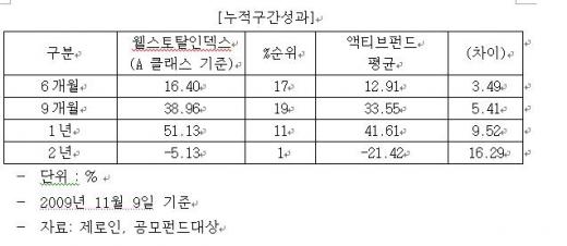 12일 펀드평가사 제로인에 따르면 지난 9일 기준 '유리MKF웰스토탈인덱스펀드'의 2년 수익률은 -5.13%를 기록했다. 같은 기간 액티브펀드의 평균 수익률은 -21.42%로 '유리MKF웰스토탈인덱스펀드'의 수익률이 16.29%포인트 상회했다.