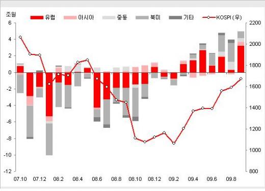 18일 코스콤 및 증권업계에 따르면 지난 9월 한 달간 외국인은 국내증시에서 총 4조8748억원을 순매수했다. 이 중 유럽계자금은 3조1759억원으로 총 외국인 순매수액의 65%에 달했다.