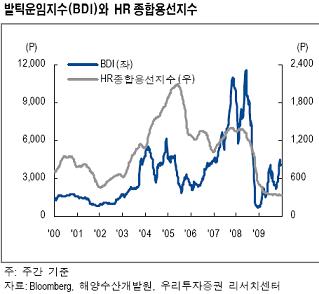컨테이너선 운임지수인 HR종합용선지수(HRCI)는 400포인트를 회복하지 못한 채 바닥을 기고 있다.(왼쪽 그래프 'BDI와 HR종합용선지수' 추이 참고).