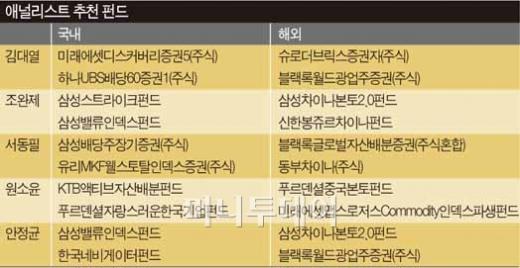 증권사 펀드애널리스트 다섯명이 2010년 유망펀드로 꼽은 국내펀드 10개와 해외펀드 10개를 대략적으로 종합한 결과다.