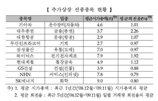 그는 "이에 따라 이번에 추가상장한 종목은 유동성이 풍부하고 주식워런트증권(ELW)나 주식연계증권(ELS) 등 연계상품 활용도 등을 감안해 업계 의견수렴을 거쳐 엄선했다"며 "추가상장을 통해 기존 개인투자자 위주의 투자자 구조가 개선될 것"으로 기대했다.