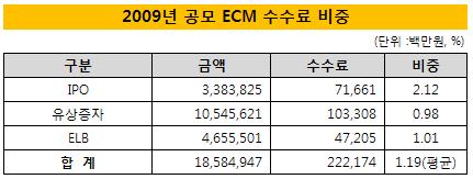 2009 더벨 리그테이블에 따르면 공모 기준 ECM 수수료(주관 및 주선 포함)는 발행금액(18조5849억원)의 1.19%인 2222억원으로 나타났다. 유상증자가 1033억원으로 가장 많았고 IPO와 주식연계채권(ELB)은 각각 716억원과 472억원으로 뒤를 이었다.