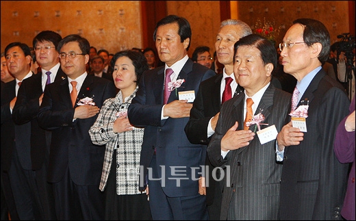 5일 오후 서울 소공동 롯데호텔에서 열린 2010년 금융권 신년인사회에 참석한 김종창 금융감독원장(사진 오른쪽 부터), 민주당 박병석 의원, 이성태 한국은행총재, 윤증현 기획재정부 장관, 한나라당 김영선 의원, 진동수 금융위원장이 국민의례를 하고 있다. 독자들의 PICK! 윤미래, 뒤늦게 알려진 사망 소식..."긴 여행 떠나" "군살 하나 없네"...산다라박, 과감한 비키니 '깜짝 뒤태' 눈길 신수지, 또 무슨 일?…"억울하고 황당한 일 당해" 의미심장 글 동서와 갈등→파혼 2번 아내..."조카는 남편 아이" 의심 충격