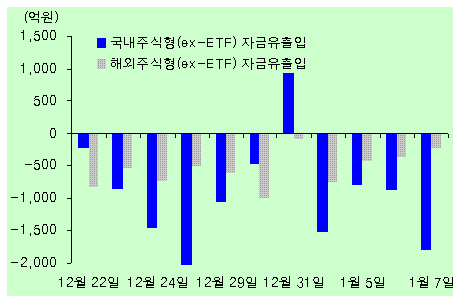 국내 주식형펀드가 새해 들어 자금 이탈을 보이고 있다. 해외 주식형펀드는 30일 연속 자금이 빠져나갔다.