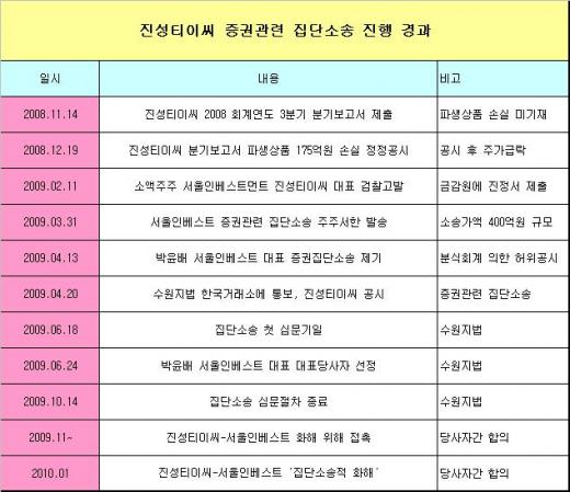 14일 한국거래소와 관련업계에 따르면 국내 증권 집단소송 1호인 '진성티이씨 분식회계'사건의 피고인진성티이씨(16,280원 ▲780 +5.03%)와 원고 대표 당사자인 서울인베스트는 주주 배상을 실시하기로 최종 합의했다. 이로써 당시 1700명의 진성티이씨 주주들 모두 화해결과에 따라 배상을 받을 수 있게 됐다.