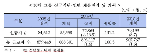 또 지난 한해 30대 그룹의 신규채용 인원은 7만 2863명으로 2008년에 비해 13.9% 감소했지만, 일자리 지키기ㆍ나누기 등 경제계의 노력에 힘입어 기업들이 대규모 감원을 단행했던 다른 국가들에 비해서는 상대적으로 적게 감소했을 뿐만 아니라 총고용은 2008년의 87만 9488명보다 1.6% 증가한 89만 3117명이었다고 전경련은 밝혔다.