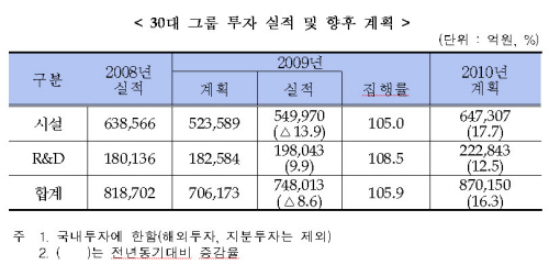 지난해 30대 그룹의 투자액은 2008년에 비해 8.6% 감소한 74조 8000억원이었으며, 시설투자액은 55조원으로 13.9% 감소하고 R&D 투자액은 19조 8000억원으로 9.9% 증가한 것으로 나타났다.