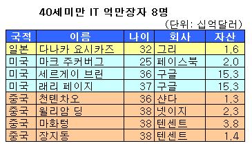 한편 포브스가 집계한 젊은 IT 갑부는 다나카 사장을 비롯해 미국인 3명, 중국인 4명 등 모두 8명이다.