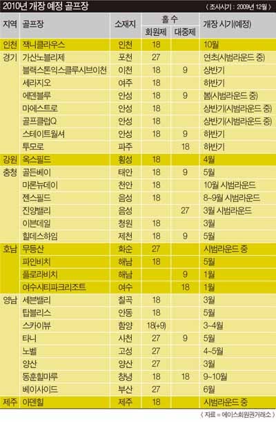 에이스회원권거래소에 따르면 올해 전국적으로 총 29개 골프장(459홀)이 새롭게 문을 열 예정이다. 지역별로는 영남권과 경기권이 각각 8개, 충청권이 6개, 호남권 4개의 골프장이 개장을 하고 제주지역과 인천, 강원권에도 각각 1개씩의 골프장이 새롭게 들어선다.