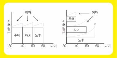 주택자금, 자녀자금, 노후자금 등의 재테크 목표가 있을 시 30대에는 주택자금→40대에는 자녀자금→ 50대 노후자금의 순으로 모으기보다는 30대부터 각각의 재무목표에 동시에 분산투자하는 것이 현명하다.