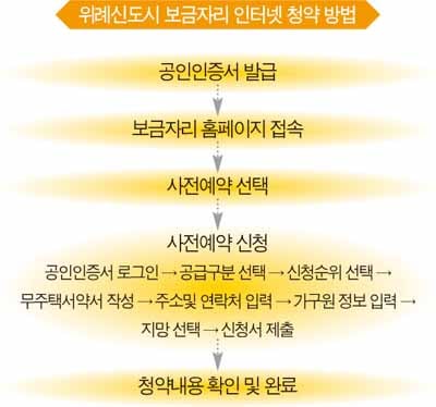 위례신도시 사전예약은 사전예약시스템(http;//myhome.newplus.go.kr)과 보금자리주택 홈페이지(www.newplus.go.kr)를 통한 인터넷 접수가 원칙이다. 다만 노령자 등 인터넷 사용이 불편한 수요자들을 위해 서울 송파구 가든파이브 라이프동 테크노관 1층에서 현장접수도 병행한다.