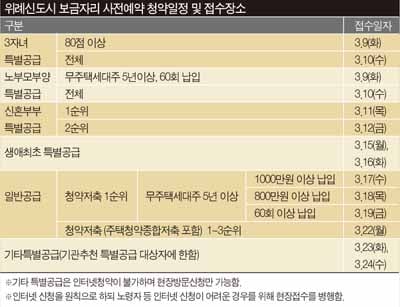 청약 신청 내용은 당일 마감시간 전까지만 변경할 수 있다. 당첨자는 4월2일 오후 2시 보금자리주택 홈페이지와 LH 서울지역본부를 통해 발표한다. 각종 증명서류는 사전예약 당첨자로 선정된 사람만 제출하면 된다.